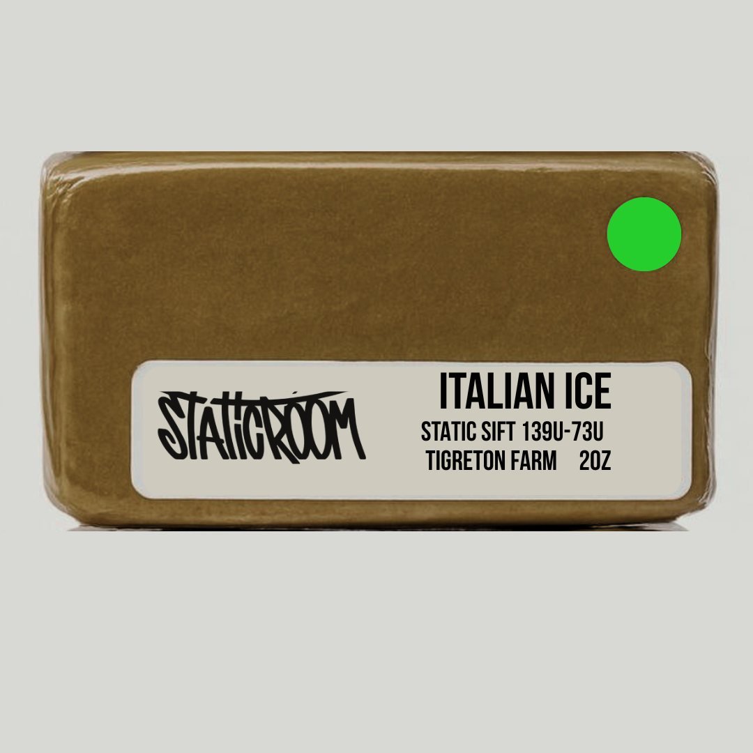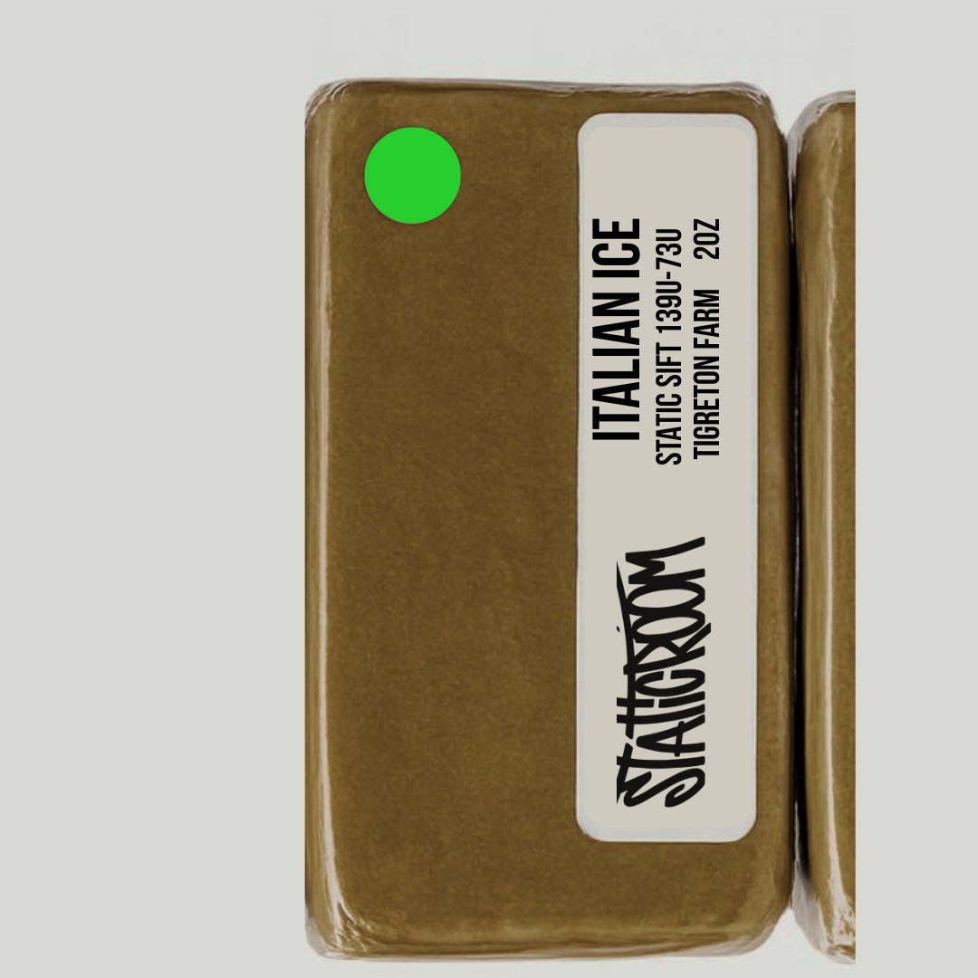 This Italian Ice Static Sift Hash from Francesco Farms delivers a refined concentrate experience. Made using dry sift techniques and filtered between 139U–73U microns, it captures the essence of the Italian Ice strain—sweet, creamy, and slightly gassy. The texture is dense and pliable, wrapped for freshness and labeled with care. Ideal for connoisseurs seeking a clean, solventless extract with bold terpene expression and smooth effects.